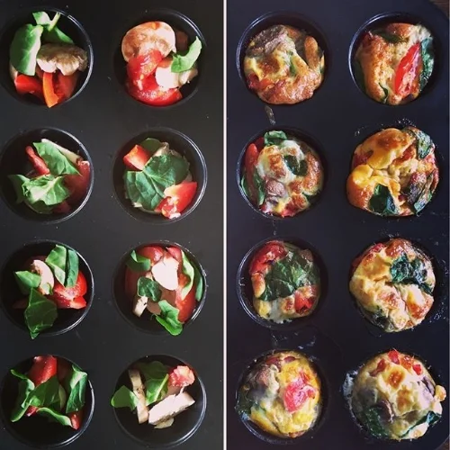 For these muffins, I chopped up some tomatoes, mushrooms and spinach. And poured some beaten eggs over them. Added some black pepper and threw them in the oven for 20 mins. Use coconut oil for a base so the muffins come off easily. Some people take out the yolk and have Egg White bites. My opinion, but the yolk is the most nutritious part so leave it in and stop wasting good food!