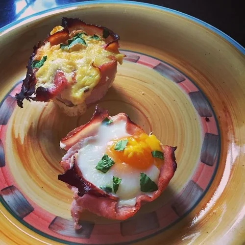 Simply use ham as your cup on your muffin tray and add your egg along with whatever ingredients you like! I kept the ones in the picture very simple but they still tasted great! Use coconut oil on your tray to allow the muffin to be lifted from the tray easily.