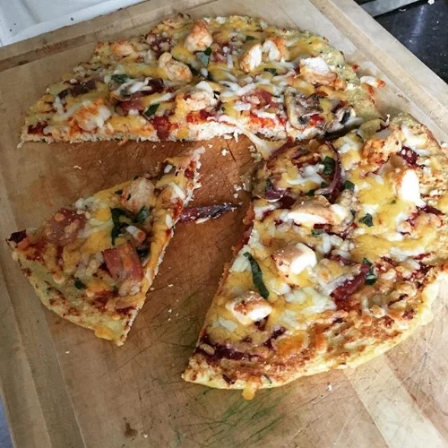 Don’t be afraid to add plenty of Ground Almonds and Basil. Too little and your pizza base will take like a giant cauliflower… and you do not want to spend 30 minutes cooking a giant cauliflower.