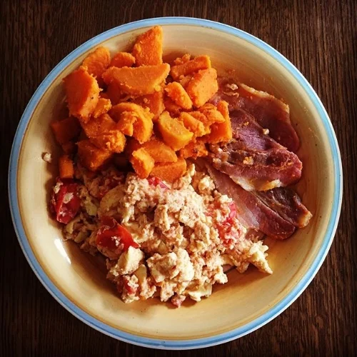 Sweet Potato Hash with Scrambled Eggs and Bacon